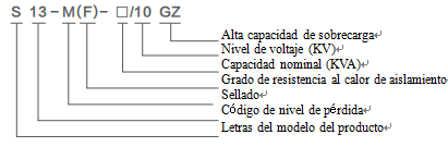 • Ejemplo: un transformador de resistente a alta temperatura y alta sobrecarga de tipo completamente sellado de sumergido en aceite , trifásico, autoenfriamiento, doble devanados, bobinas, regulación de tensión sin excitación, con clase de resistencia térmica de aislamiento F, del código de nivel de pérdida "13", con capacidad nominal 100kVA y de baja tensión 10kV, cuya identificación del modelo de distribución es : S13-M (F) -100 / 10GZS13-M (F) -100 / 10GZ
