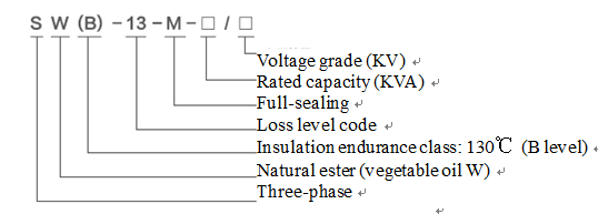 Example:10kV fully-enclosed high-temperature resistant vegetable oil distributiontransformer with three-phase, natural ester, self-cooling, duplex winding,non-excitation voltage regulation; insulation endurance class: B; loss levelcode: 13; rated capacity: 100kVA; model: SW(B)13-M-100/10