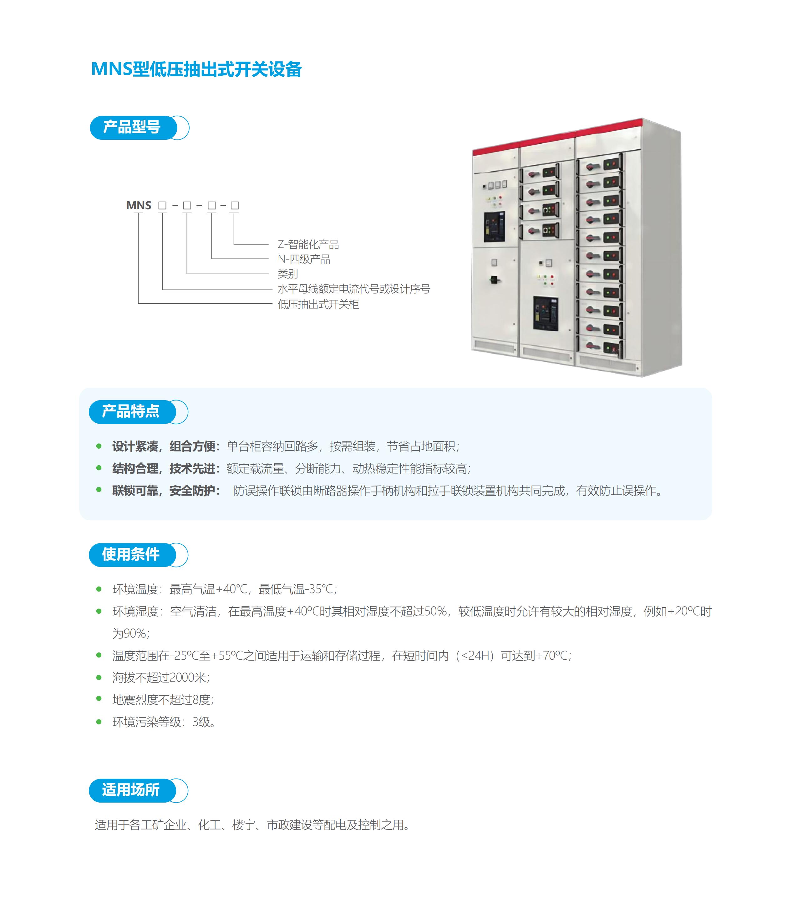 技術水平高:MNS低壓開關柜的額定載流量,分斷能力,動熱穩定性能指標均高于其它型號的低壓開關柜,并且維護方便,安全可靠。主要參數達到國際先進水平。
